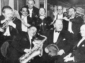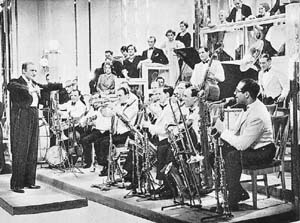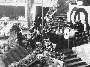 Noch bevor die Tonspur diesen Szenarien zu einem eigenen akustisch-musikalischen Signal verhalf, begannen sie sich auf der stummen Leinwand zu formieren. So zeigt Ewald André Dupont in Varieté (1925) eine kurze Sequenz mit »Alex Hyde and his Orchestra«. Dieser deutsch-amerikanische Bandleader brachte als einer der ersten 1924 eine Hotdance-Besetzung aus New York nach Berlin. Sie stellt einen Meilenstein in der Historie des Jazz in Deutschland dar;36 ihr entstammten keymen der berliner Studiomusiker-Szene der 20er und 30er Jahre (wie der Gitarren- und Banjosolist Mike Danzi oder der Saxophonist Walter »Kal« Kallander).37 Zwar etablierte sich zeitgleich die preiswerte und bequemere Praxis, Statisten mit Instrumenten zu einer Band - insbesondere in Hintergrundsituationen - auszustaffieren, was sich im Tonfilm mit dem Verfahren der Playback-Aufnahme günstig fortsetzen ließ. Allerdings wurde diese Ausstattung gelegentlich von musikalisch ambitionierten Regisseuren bemängelt, und zwar mit dem Argument, daß eben professionelle Tanzmusiker eine lebendigere Ausstrahlung, ja einfach eine andere Körpersprache mitbrächten.38