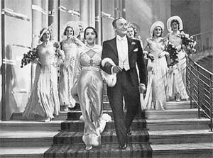 »Das Privatleben des modernen Menschen ist überhaupt mehr und mehr in die Öffentlichkeit verlegt worden!«51 So schreibt 1931 der »Führer durch das lasterhafte Berlin«. Und weiter: »Die Avantgarde der großen und der größeren Welt bevorzugt die durch den Glanz ihres Namens ausgezeichneten Nachmittagstees in den großen Hotelhallen.«52 Zumal deren überaus reichlich dimensioniertes Ausmaß »kennzeichnete das Grand Hotel alten Stils in Berlin«. Alle Treppenführung mündet an diesem Ort - und seine Mitte gliedert nicht selten eine große Freitreppe.53 Wohl kein Interieur urbaner Architektur verband sich so sichtbar mit der Geschichte des Bühnenbilds der Operette. Und als Treppen-Tableau wurde es zum »bedeutendsten Requisit der Ausstattungsrevue«,54 ausgehend von Paris, der musikalischen Heimat Offenbachs.55 Es begleitet denn auch wiederholt jene auf »high-life«, Ball und Stimmung akzentuierten Handlungen der Tonfilmoperette: Erst in diesem Ambiente wird im Ufa-Film Der Sieger (1931/32, Hans Hinrich, Paul Martin) Hans Albers, mit Käthe von Nagy an seiner Seite, dem Titel des Films wirklich gerecht. Als Sammelbild in Serien der Zigaretten-Bilder-Alben vielverbreitet, wurde es in den 30er Jahren zu einem der bekanntesten Motive des Schauspielers. Hierin erneuert sich eine Sozialfigur des 19. Jahrhunderts - und eine Ikone der Operette: der Bonvivant mit Frack, Chapeau claque und weißem Chemisett. Eugen Szatmari berichtete schon 1928 über das Hotel Eden in der Budapester Straße: »am Abend wimmelt es im Edenpavillon von Fracks und Abendkleidern«. Aber auch in der Saison um 1930 blieb dieser Aufzug auf den mittelständischen Bällen bei Kroll oder in den Zoo-Festsälen so vorherrschend, wie ihn heute kaum noch der Wiener Opernball zu zelebrieren vermag.