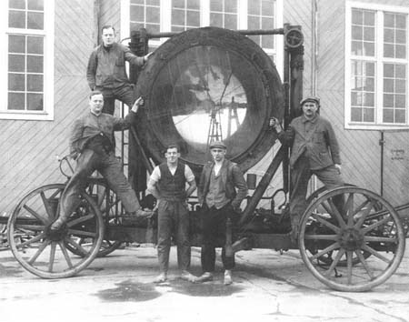 Arbeiter mit Riesenscheinwerfer auf dem Gelände der Jofa-Ateliers Das Atelier wird 1929 auf Tonfilm umgestellt und 1931 von der Jofa Tonfilm-Atelier GmbH, an der die Albatros-Werke und die Tobis beteiligt sind, übernommen. Nach einer gründlichen Umgestaltung gliedert sich der Atelier-Komplex nun in drei Gruppen, bei denen jeweils ein kleines Atelier einem großen zugeordnet ist: