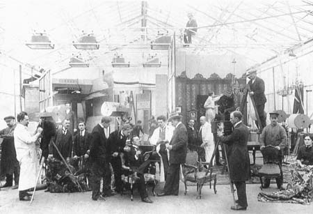 Dreharbeiten im May-Atelier, Weißensee, 1913: Walter Schmidthäßler (sitzend), Hermann Warm »In neuerer Zeit (...) fand der dritte Typ des Ateliers zu ebener Erde immer mehr Liebhaber. Seine Vorzüge sind in erster Linie die Erleichterung des Transportes von schweren Möbeln, Wagen usw. direkt in die Halle hinein, die Verringerung der Baukosten und das Fernhalten feuergefährlicher Nebenbetriebe vom Atelier selbst. Grundlegend wurde hier eine Reihe von Bauten in Weißensee, so vor allem das für die Vitaskop von Greenbaum errichtete Doppelglashaus.« (G. Victor Mendel: Von der Dachstube zur Luftschiffhalle. In: LBB Luxusnummer »30 Jahre Film«, 1924, S. 29).