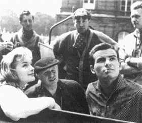 Dreharbeiten zu MONPTI (1957). Romy Schneider, Helmut Käutner, Horst Buchholz. Im Hintergrund: Horst Pehlke (m), Operator Günther Senftleben (r).