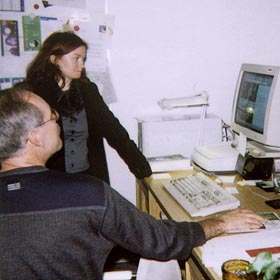 James Steakley und Miriam Alexowitz bestaunen den Kongress-Bilderbogen vom Vorjahr |